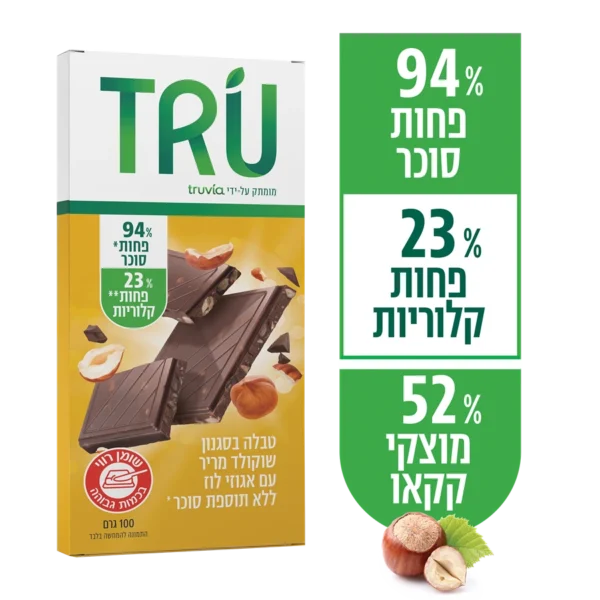 רכיבים: עיסת קקאו, סיבי אינולין, ממתיק (אריתריתול), חמאת קקאו, ממתיק Truvia, סטיביה (ממתיקים(אריתריתול, גליקוזידים של סטיביול), חומרי טעם ור יח), אגוזי לוז (9%), מתחלב (לציטין סויה), מכיל 52% מוצקי קקאו לפחות.