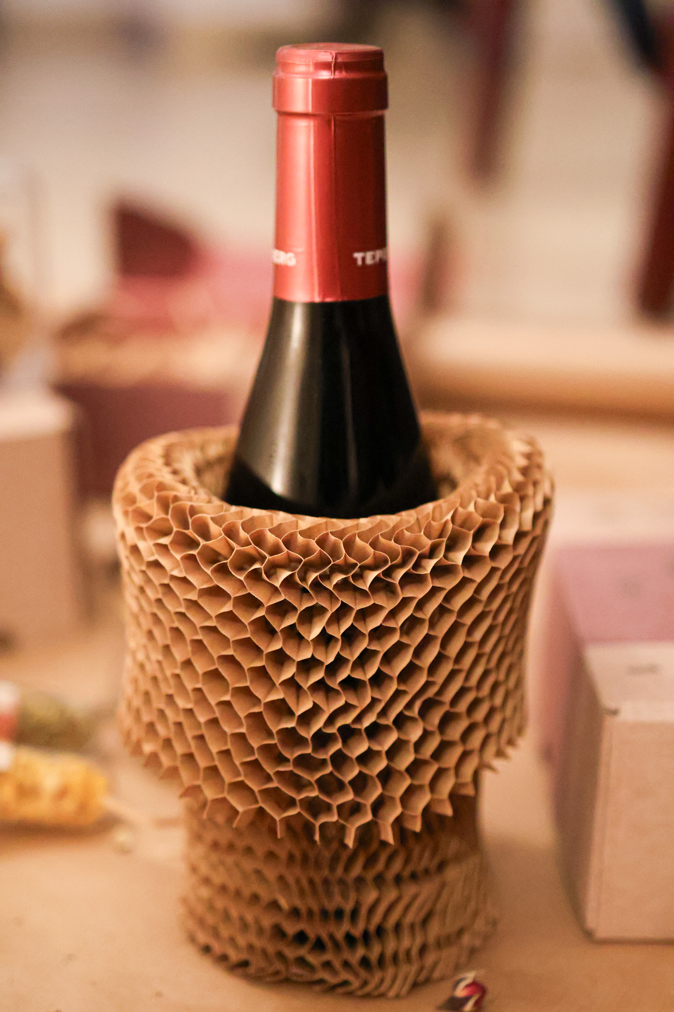 היין מגיע ארוז בעטיפת כוורת, בכיסוי כוורת מנייר קראפט דקורטיבי