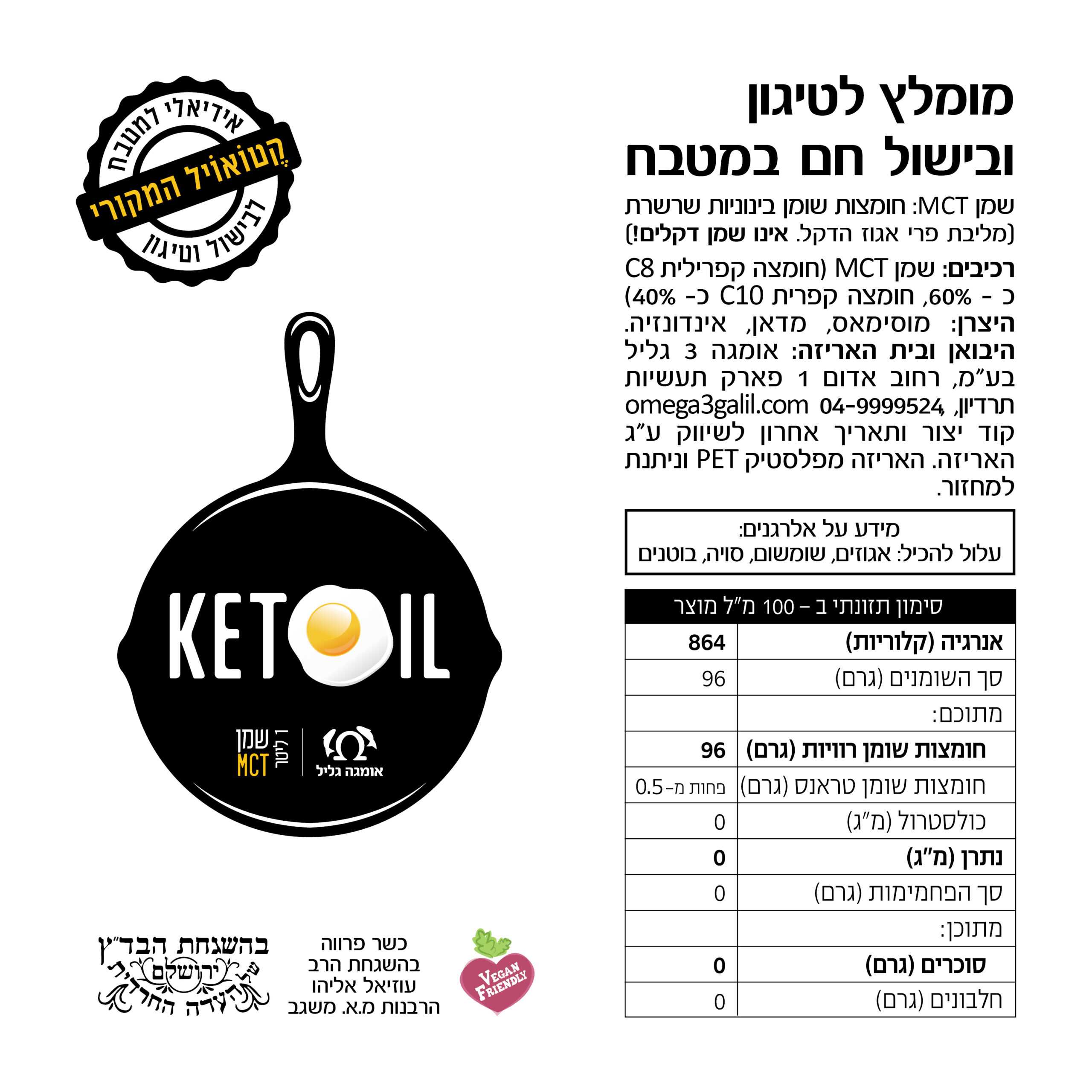 שמן MCT מכיל חומצות שומן רוויות בינוניות שרשרת (Medium-chain triglyceride) – עם 6 עד 12 פחמנים. שמן MCT קטו-אויל של אומגה גליל מכיל 100% חומצות שומן רווית, מתוכן לפחות 98% חומצות קפרילית (55-65%) וקפרית (35-45%).