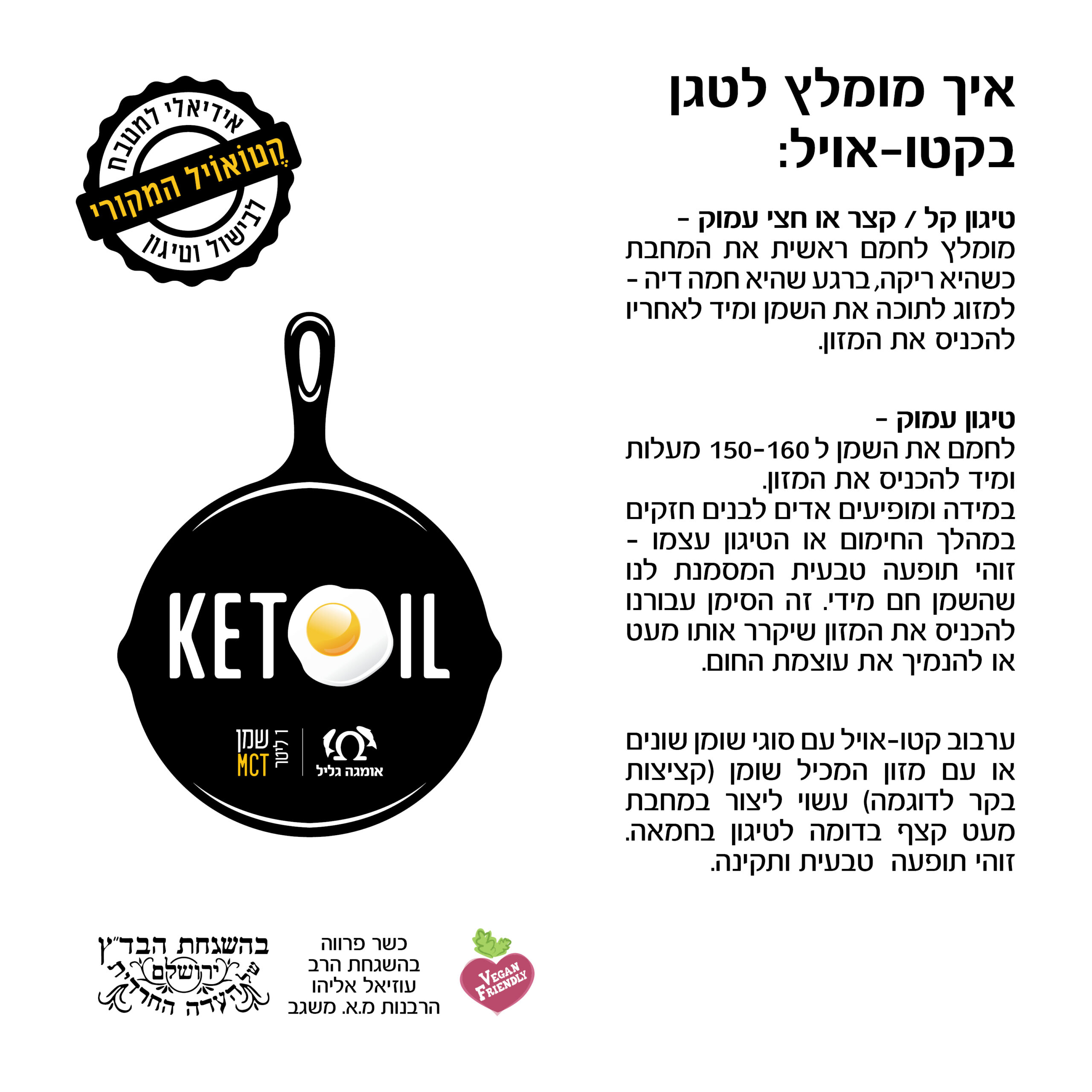 השמן החדש והאידיאלי לטיגון ובישול חם במטבח שאינו מתחמצן ונשרף כשמני מטבח אחרים. מאפשר יותר מחזורי טיגון מבלי להחליפו, ניטראלי כמו מים ללא כל טעם או ריח ואינו מאפיל על טעמם הטבעי של חומרי הגלם.